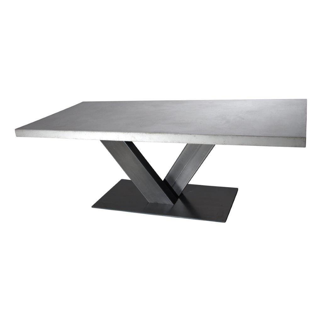 Deze robuuste betonnen tafel is voorzien een staal V poot onderstel. Ons V poot tafelonderstel is de basis voor een echt stoere robuuste tafel. Dit tafelonderstel is gemaakt uit zware stalen kokers van 20 x 10 cm, deze grote kokers geven de tafel een echte robuuste uitstraling. Om de tafel ook bij grotere tafelbladen (220cm-300cm) stabiel te houden wordt deze V poot geleverd met een 12mm dikke vloerplaat. Dunnere vloerplaten buigen en zijn niet zwaar genoeg om grotere tafelbladen, bij een last op de kopse kant, stabiel te houden. Het blad is gemaakt van MDF met een dekkende betonlook coating.