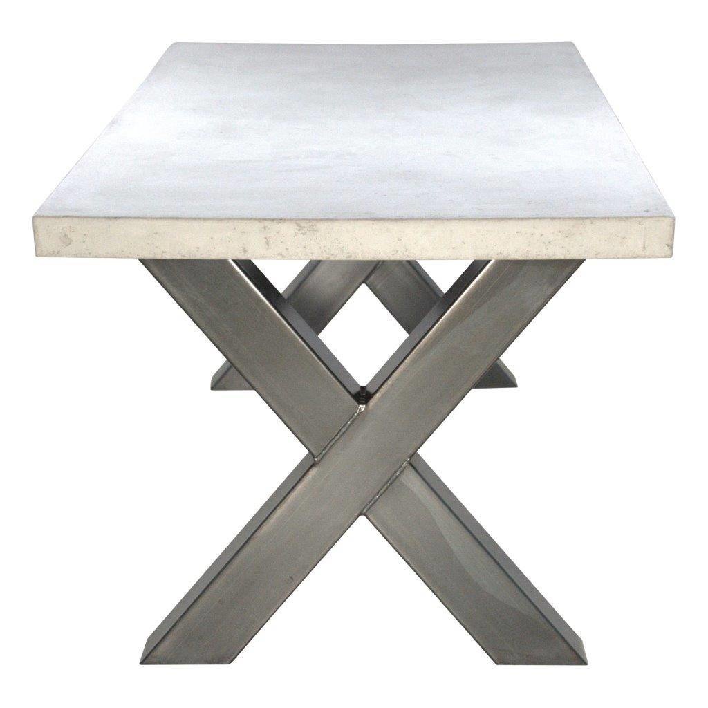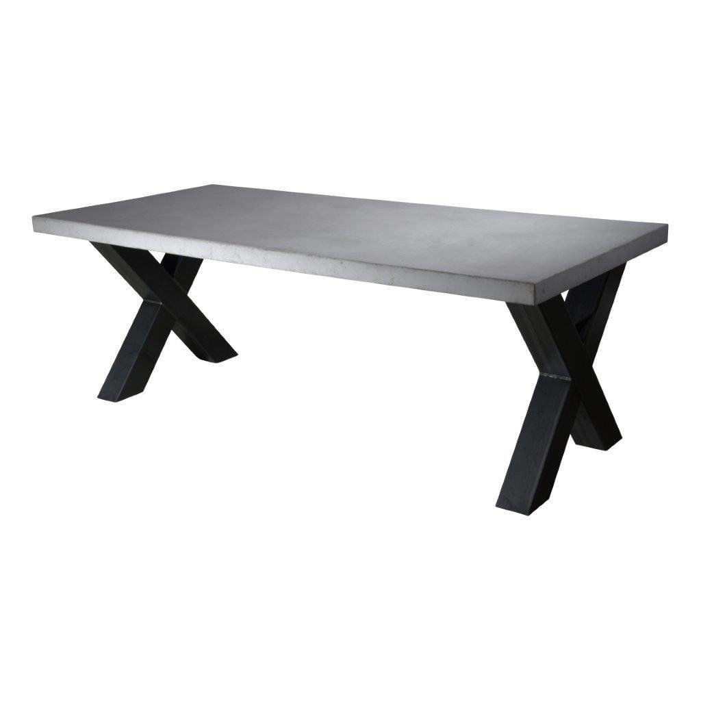 Beton tafel voorzien van zware X tafelpoten.