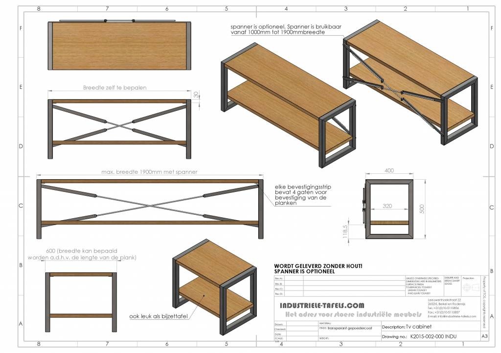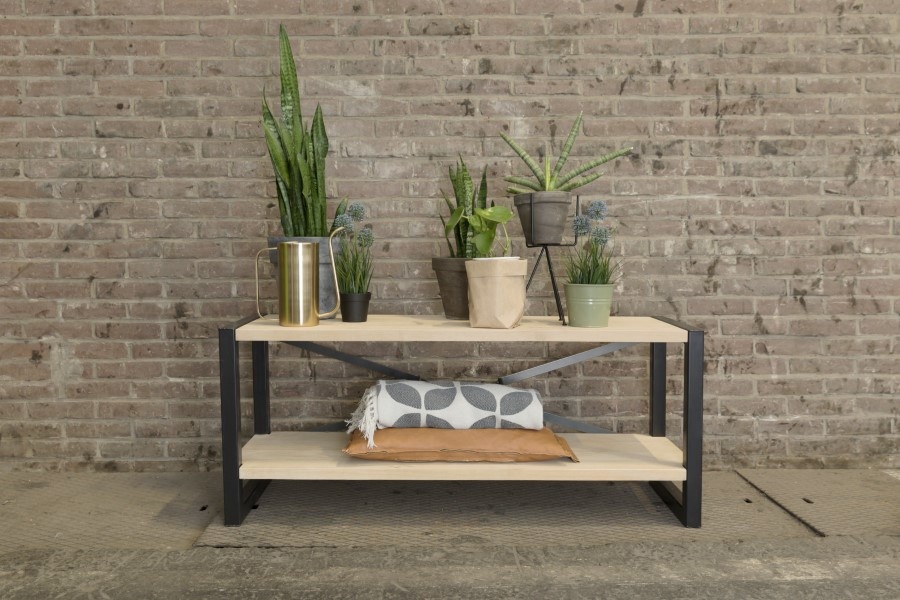 De bovenste plank dient 8 cm korter te zijn dan de onderste plank. Wij leveren enkel het stalen frame zodat u zelf kunt kiezen met welk type planken en welke afmetingen u het meubel wilt afwerken. Om de bovenste plank gelijk te krijgen met de bovenkant van het frame moet een plankdikte gebruikte worden van 28-30 mm.