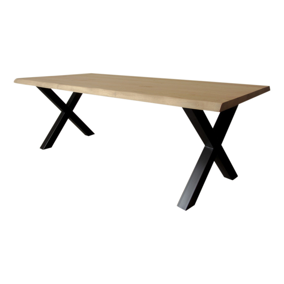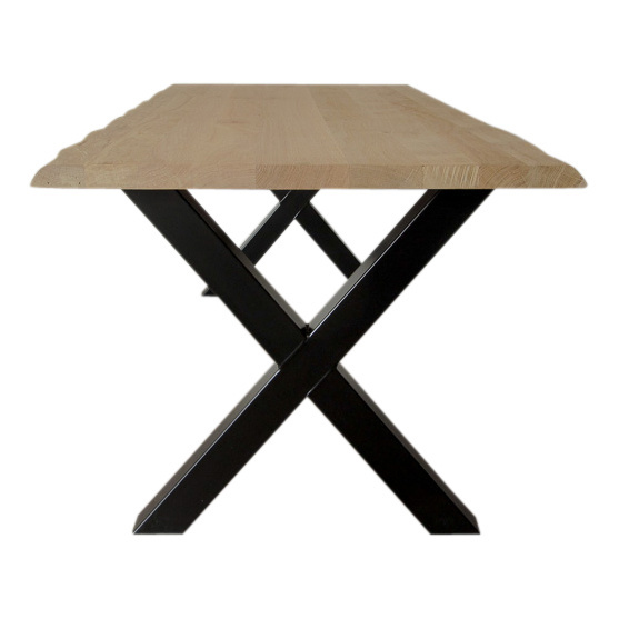 Industriële tafel voorzien van standaard X tafelpoten en eiken tafelblad.