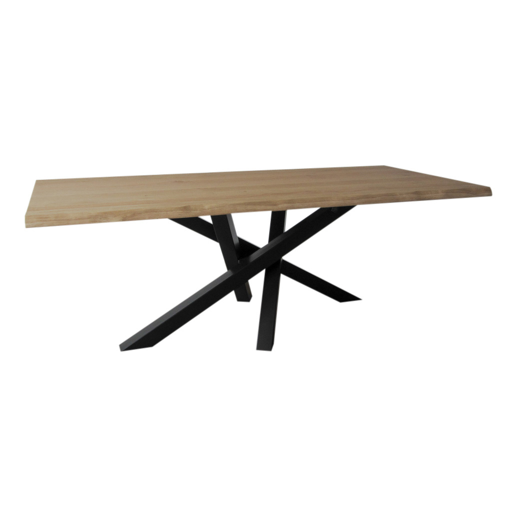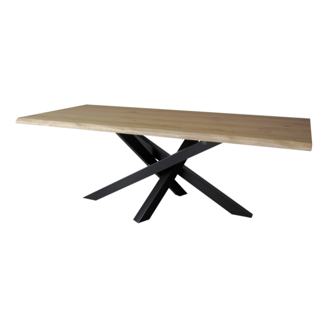 Het tafelblad is vervaardigd uit rustiek eiken wat de tafel een warm maar stoer karakter geeft. Ons eiken wordt zorgvuldig geselecteerd uit duurzaam beheerde bossen. Om de eiken planken te kunnen verwerken tot rustieke tafelbladen worden de planken zorgvuldig gedroogd. Als de rustieke eiken planken droog genoeg zijn worden ze geselecteerd en verwerkt door onze meubelmaker tot een mooi robuust geheel. De onderzijde van het tafelblad is voorzien van een stalen strip om de natuurlijke werking (kromtrekken) van het hout zoveel mogelijk tegen te gaan. Om dit zelf ook zoveel mogelijk tegen te houden adviseren wij het blad spoedig na levering te behandelen met een olie of lak.