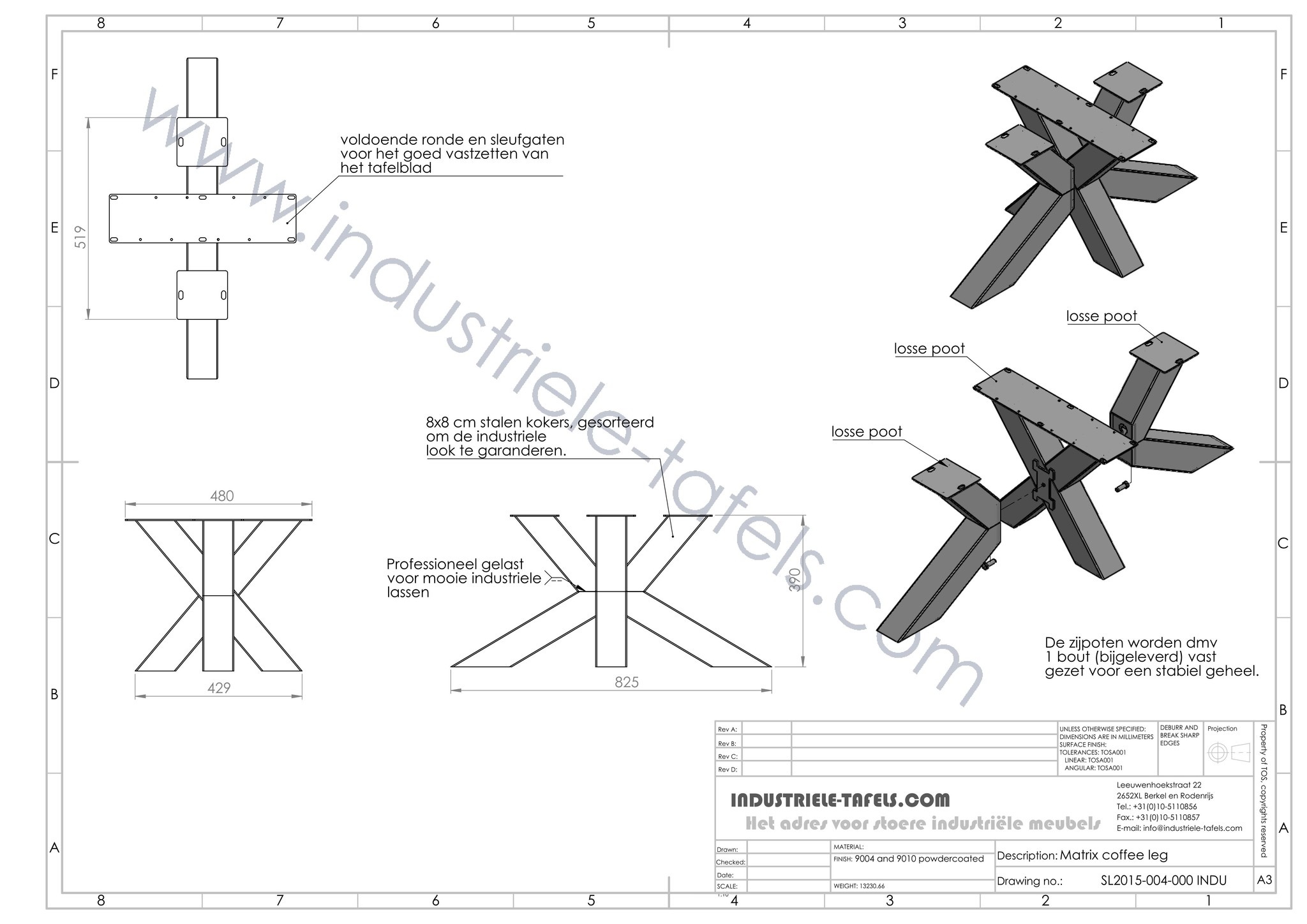 Vanwege het gewicht en de afmetingen is ons industriële matrix poot een demontabel onderstel, hierdoor is het te versturen of bij ons af te halen. Door het slimme bevestigingssysteem is het stabiele onderstel in enkel minuten te monteren / demonteren (bevestigingmaterialen worden bijgeleverd).
