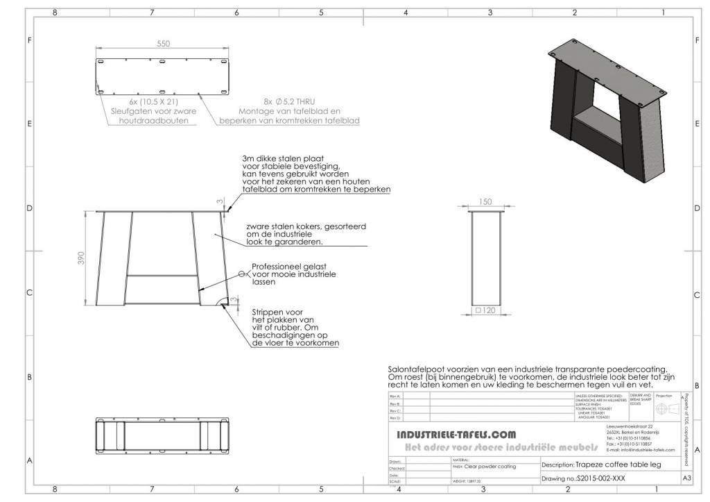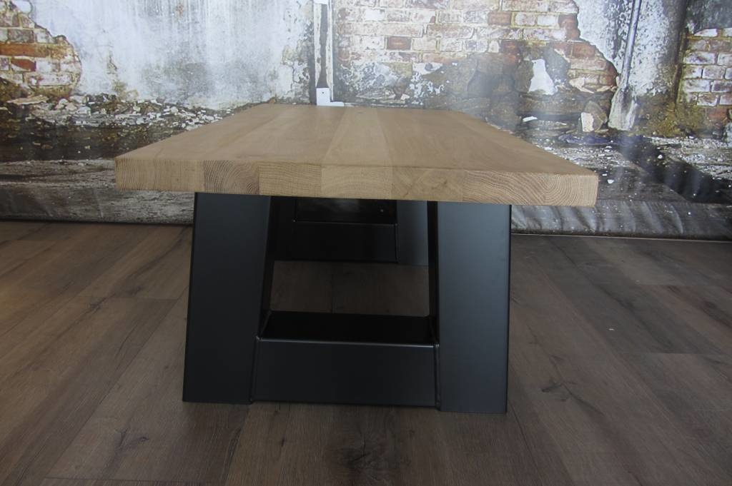 Onze trapezium salontafel poten, gemaakt uit zware stalen kokers van 12 x 12 cm breed, geven uw salontafel/bankje een echt industrieel karakter. De gebruikte stalen kokers staan iets onder een hoek waardoor de poot aan de onderzijde breder is dan de bovenzijde hierdoor ontstaat mooi massief uiterlijk. De zichtbare lassen, gemaakte door gecertificeerde lassers, geven de salontafel poten een extra stoer en robuust karakter, echt industrieel.
