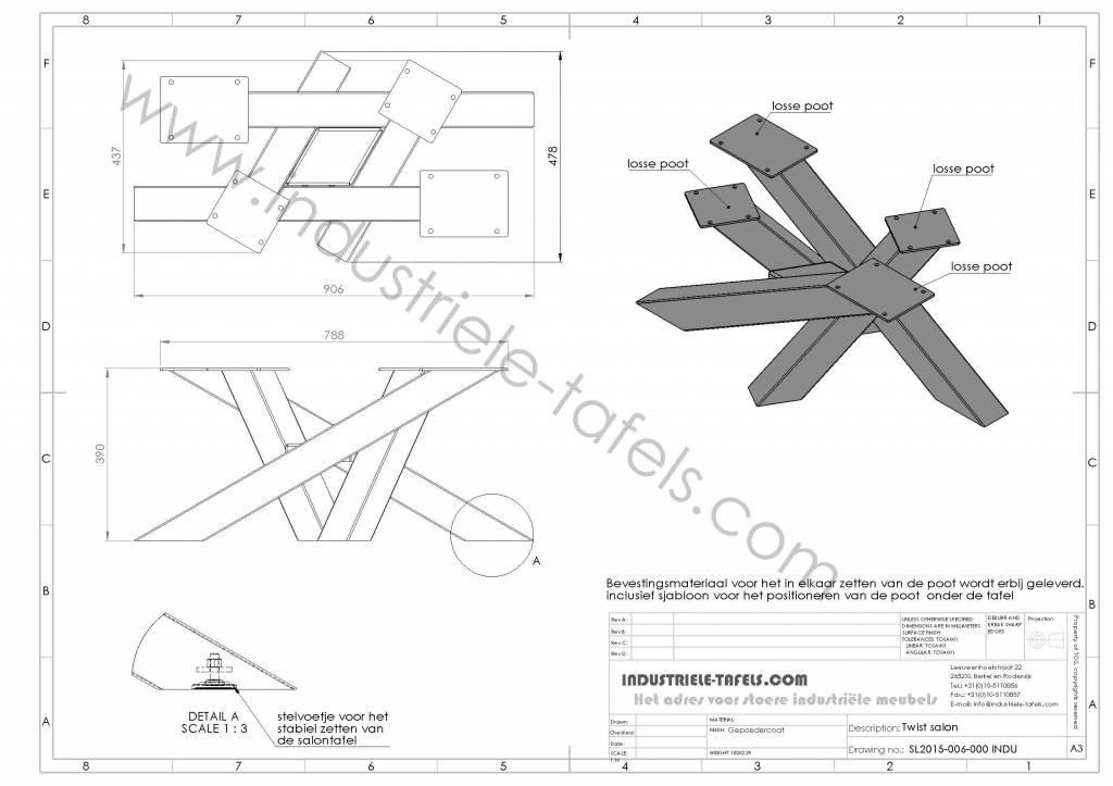 Vanwege de afmetingen is ons industriële twist poot een demontabel onderstel, hierdoor is het te versturen of bij ons af te halen. Door het slimme bevestigingssysteem is het stabiele onderstel in enkel minuten te monteren / demonteren (bevestigingmaterialen worden bijgeleverd).