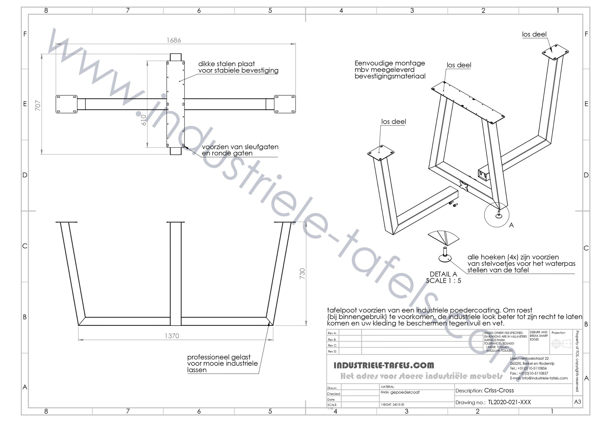 Elke individuele koker heeft een afmeting van 8x6 cm. De kokers kruizen elkaar op de vloer. Dit onderstel is demontabel en daardoor gemakkelijk te vervoeren. De zichtbare lassen zorgen voor een stoer en industrieel uiterlijk terwijl het een elegant model blijft. De tafelpoot is voorzien van stelvoetjes waardoor deze altijd mooi vlak op de vloer zal staan. Het stalen tafelonderstel Criss-Cross komt het best tot zijn recht onder een recht, boomstam of (half)ovaal tafelblad. Deze stalen middenpoot straalt een rustige sfeer uit en past ontzettend goed binnen in een industrieel of modern interieur.
