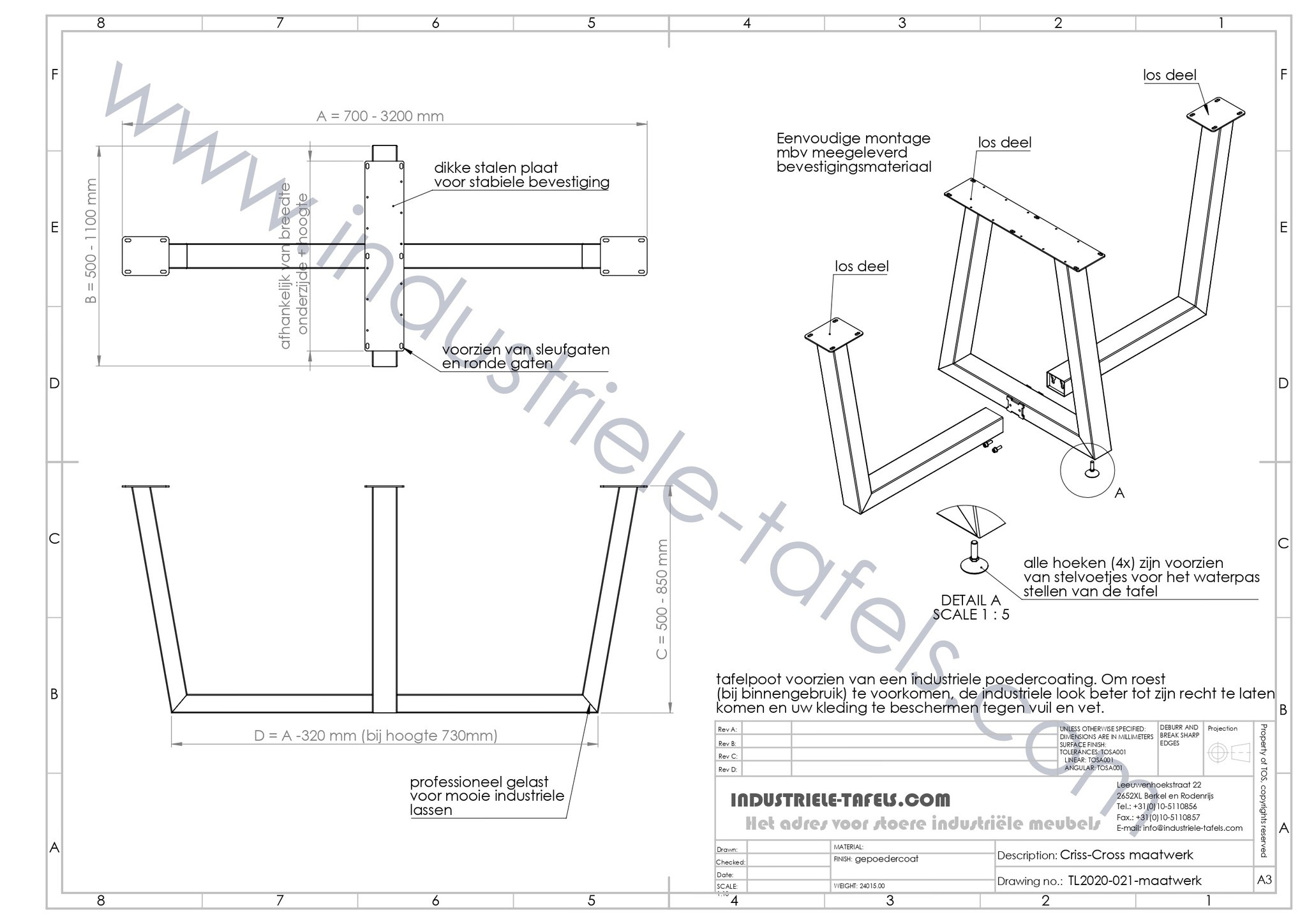 Elke individuele koker heeft een afmeting van 8x6 cm. De kokers kruizen elkaar op de vloer. Dit onderstel is demontabel en daardoor gemakkelijk te vervoeren. De zichtbare lassen zorgen voor een stoer en industrieel uiterlijk terwijl het een elegant model blijft. De tafelpoot is voorzien van stelvoetjes waardoor deze altijd mooi vlak op de vloer zal staan. Het stalen tafelonderstel Criss-Cross komt het best tot zijn recht onder een recht, boomstam of (half)ovaal tafelblad. Deze stalen maatwerk middenpoot straalt een rustige sfeer uit en past ontzettend goed binnen in een industrieel of modern interieur.