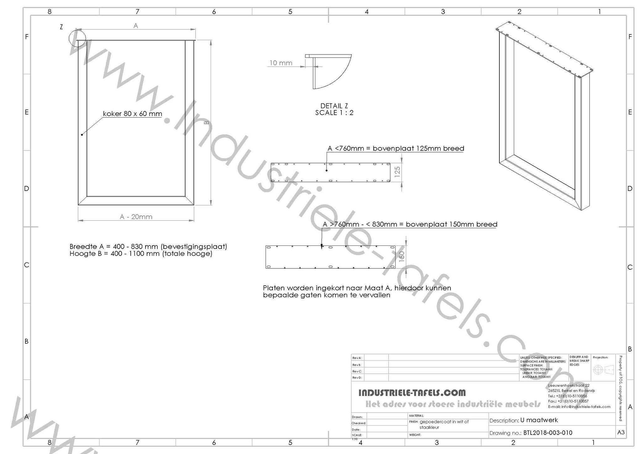 Voor de exacte afmetingen van de stalen tafelpoot verwijzen wij u door naar de technische tekening. Deze vindt u tussen de afbeeldingen.