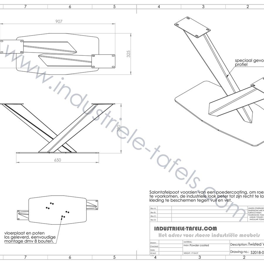 Vanwege de afmetingen is onze Twisted V een demontabel salontafelonderstel, hierdoor is hij te versturen of bij ons af te halen. Door het slimme bevestigingssysteem is het stabiele onderstel in enkel minuten te monteren / demonteren (bevestigingsmaterialen worden bijgeleverd).