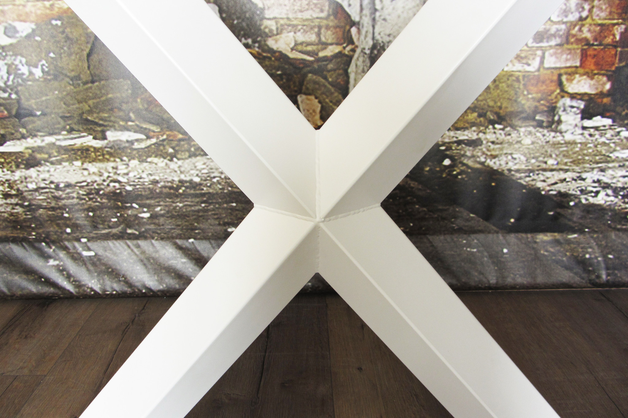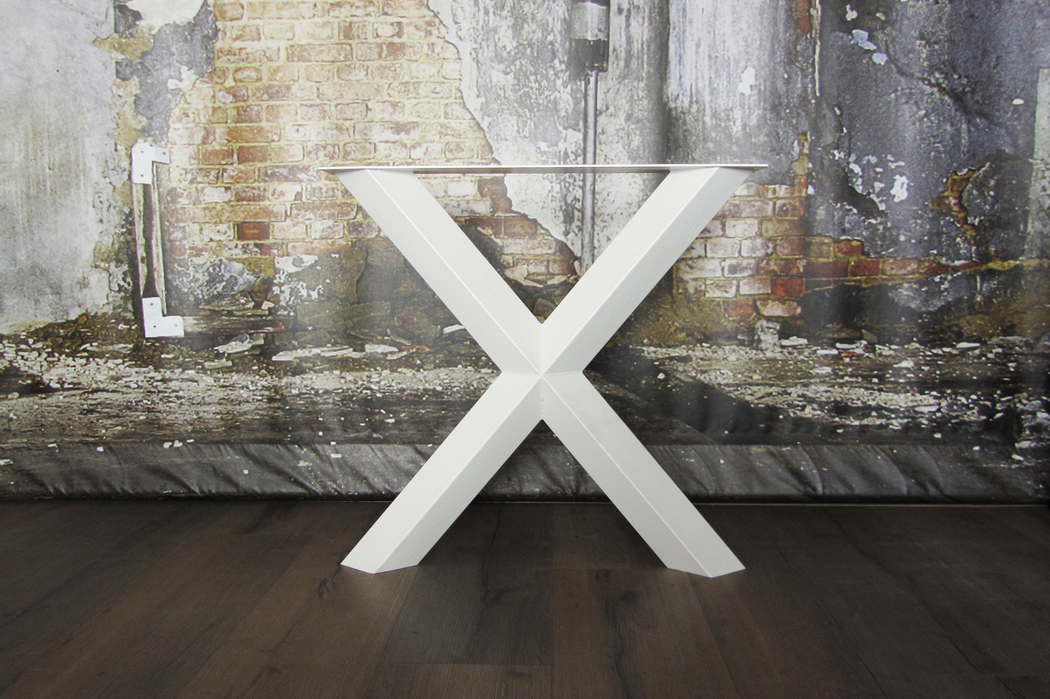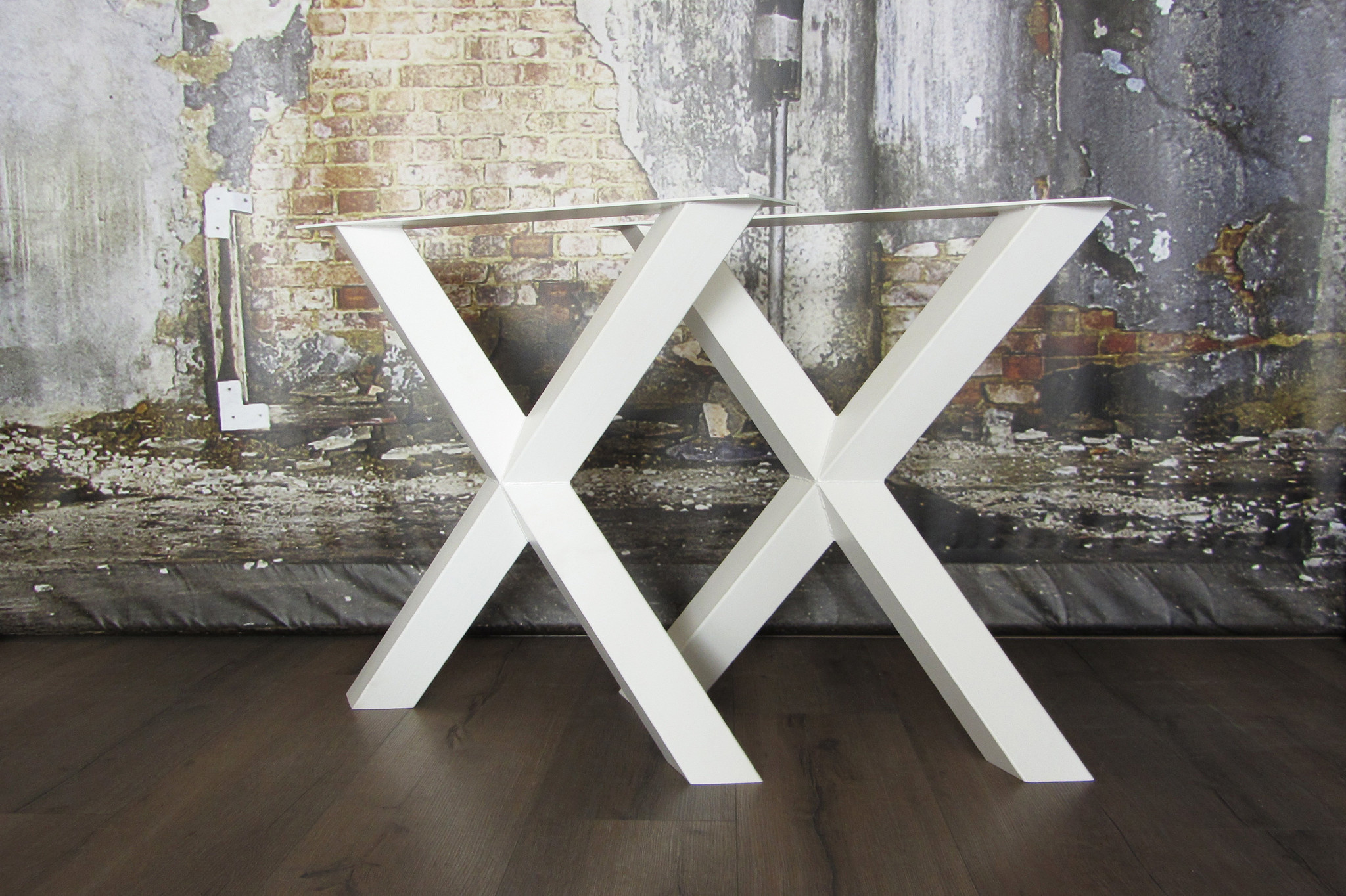 Onze stalen tafelpoten model X kruispoten, gemaakt uit stalen kokers van 8 x 8 cm breed, geven uw tafel een echt industrieel karakter. De gebruikte stalen kokers kruisen elkaar waardoor de populaire X vorm ontstaat. De zichtbare lassen geven het tafelonderstel een extra stoer en robuust karakter, echt industrieel! De X model tafelpoten zijn al jaren populair. Mede dankzij de stoere look die de tafelpoot geeft, maar zeker ook de praktische kant van de tafelpoot. Door het X model kan je met een eettafelbank gemakkelijk aanschuiven zonder de bank te moeten verplaatsen.