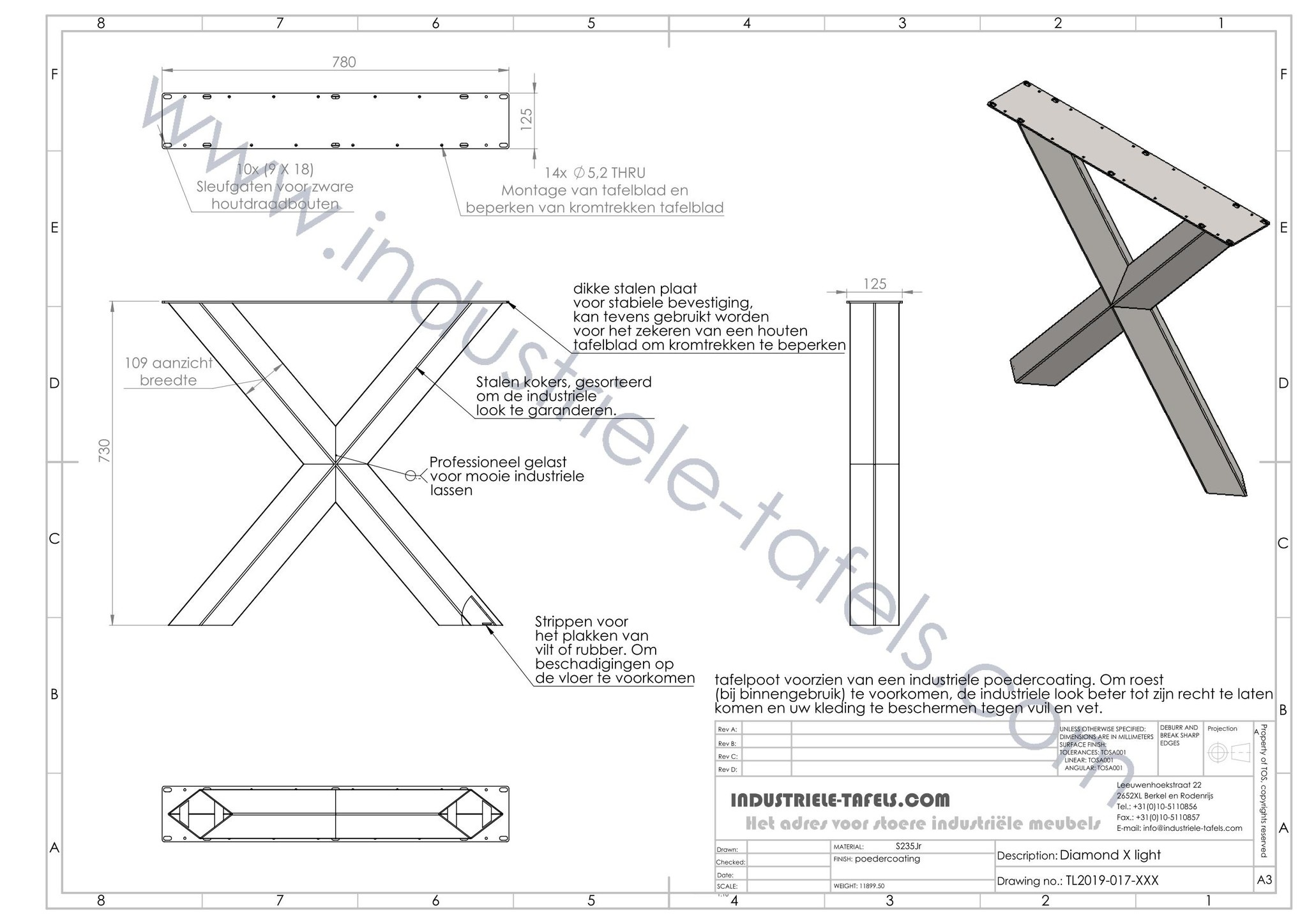Stalen tafelpoten zijn niet weg te denken op interieur gebied! De stalen kruispoot is al enige tijd erg populair, maar nu heeft Industriele-tafels.com hier een originele twist aan gegeven. De gedraaide koker zorgt voor een diamant effect, vandaar de gekozen naam Diamond X. Zorgt u zelf voor het tafelblad, dan kunt u bij ons terecht voor een uw stalen tafelpoten. Geef uw tafel in een handomdraai een nieuwe look!