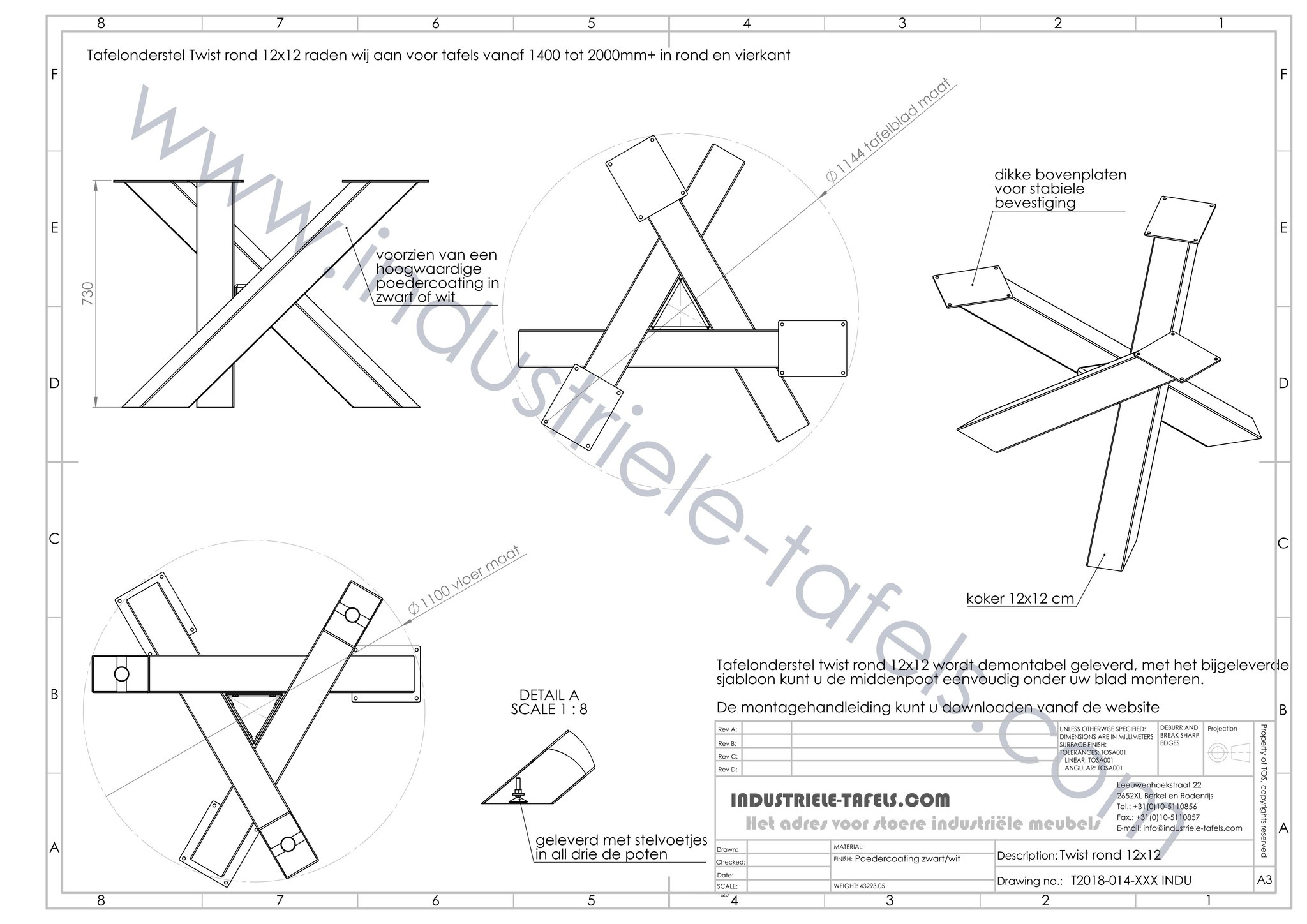Voor de exacte afmetingen van de stalen tafelpoot verwijzen wij u door naar de technische tekening. Deze vindt u tussen de afbeeldingen.
