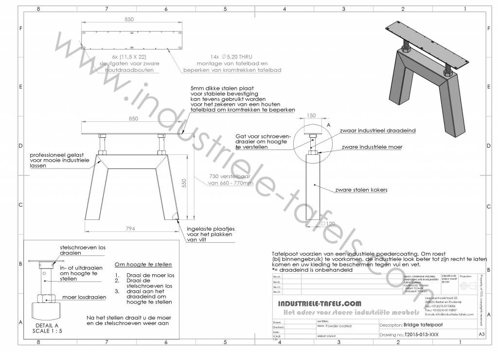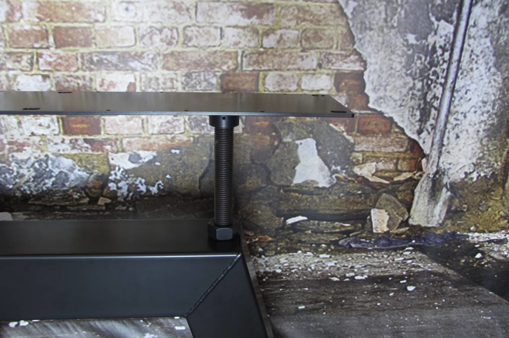 Onze Bridge tafelpoten, gemaakt uit zware stalen kokers van 12 x 12 cm breed, geven uw tafel een echt industrieel karakter. De gebruikte stalen kokers staan iets onder een hoek waardoor de poot aan de bovenzijde smaller is dan de onderzijde hierdoor ontstaat een mooi massief uiterlijk. De zichtbare lassen, gemaakte door gecertificeerde lassers, geven het tafelonderstel een extra stoer en robuust karakter, echt industrieel. Aan de bovenzijde is de tafelpoot voorzien van zware, stalen draadeinden waardoor de tafelpoot in hoogte verstelbaar is. De minimale hoogte is 66 cm en de maximale hoogte is 77 cm. Zie onze tekening voor meer informatie.