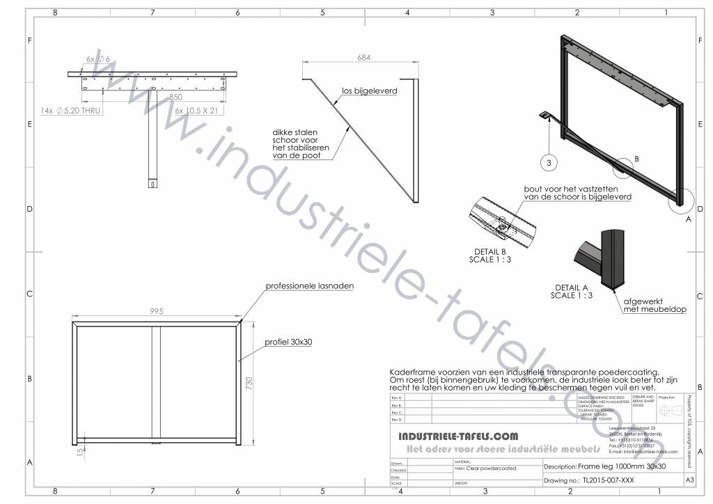 Ons frame model tafelpoot, gemaakt uit kokers van 3 x 3 cm breed, geven uw tafel een echt industrieel karakter. De gebruikte stalen profielen worden in de vorm van een vierhoek gelast, in de afmeting 1000x730mm.