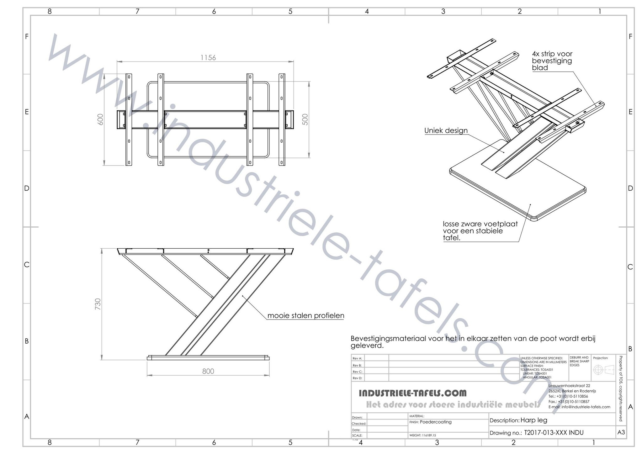 Voor de exacte afmetingen van de stalen tafelpoot verwijzen wij u door naar de technische tekening. Deze vindt u tussen de afbeeldingen.