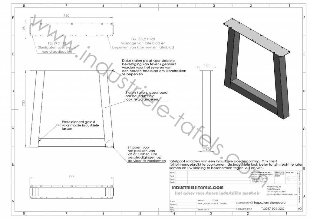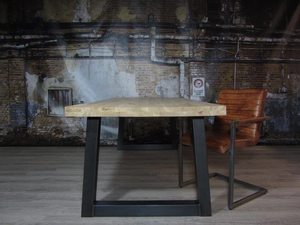 Onze trapezium tafelpoten, gemaakt uit stalen kokers van 8 x 8 cm breed, geeft uw tafel een echt industrieel karakter. De gebruikte stalen kokers staan iets onder een hoek waardoor de poot aan de onderzijde breder is dan de bovenzijde hierdoor ontstaat mooi massief uiterlijk. De zichtbare lassen, gemaakte door gecertificeerde lassers, geven het tafelonderstel een extra stoer en robuust karakter, echt industrieel.