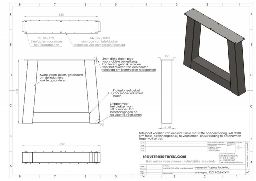 Onze trapezium tafelpoten, gemaakt uit zware stalen kokers van 12 x 12 cm breed, geeft uw tafel een echt industrieel karakter. De gebruikte stalen kokers staan iets onder een hoek waardoor de poot aan de onderzijde breder is dan de bovenzijde hierdoor ontstaat mooi massief uiterlijk. De zichtbare lassen, gemaakte door gecertificeerde lassers, geven het tafelonderstel een extra stoer en robuust karakter, echt industrieel.