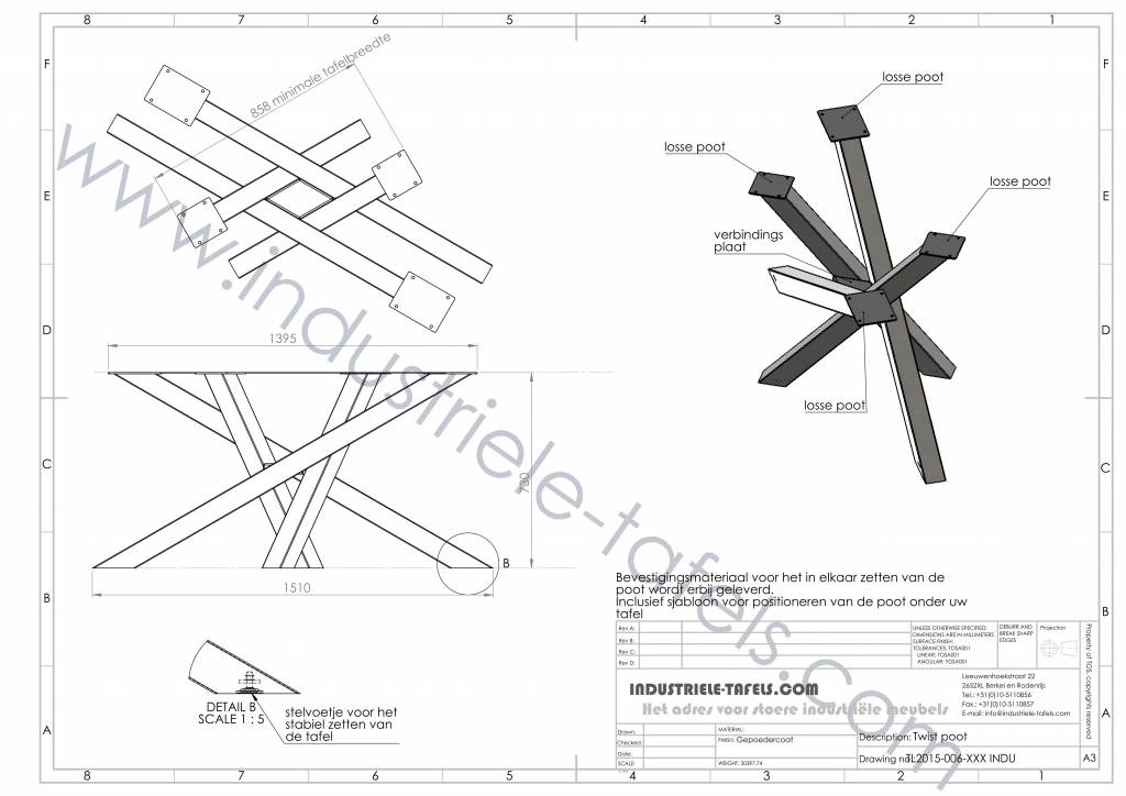 Vanwege de afmetingen is onze twist tafelpoot een demontabel onderstel. Om de montage te vereenvoudigen van het twist onderstel hebben wij een speciaal sjabloon ontwikkeld, de montagehandleiding kunt u hiervinden