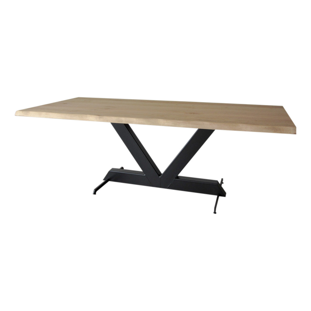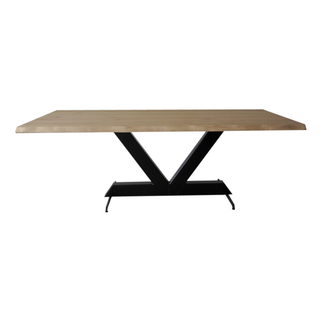 Ons V poot tafelonderstel is de basis voor een echt stoere robuuste tafel. Dit tafelonderstel is gemaakt uit zware stalen kokers van 12 x 8 cm, deze grote kokers geven de tafel een echt stoere uitstraling. Bij dit ontwerp is rekening gehouden met het aanschuiven van stoelen rondom de tafel. Doordat de vloerplaat ontbreekt kan je gemakkelijk de stoelen aanschuiven, en is er minder kans op beschadiging aan het onderstel. De strippen onder de tafel zijn voorzien van stelvoetjes om de tafel waterpas te zetten.
