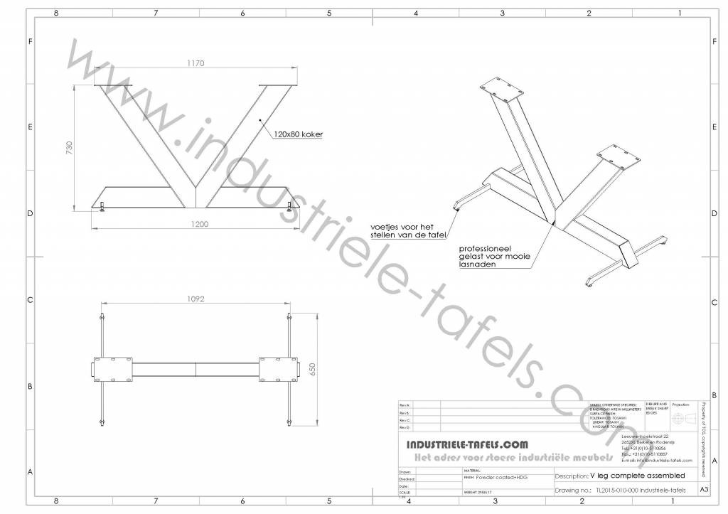 Ons industriële V poot is een demontabel onderstel, hierdoor is hij te versturen of bij ons af te halen. Door het slimme bevestigingssysteem is het stabiele onderstel in enkel minuten te monteren / demonteren.