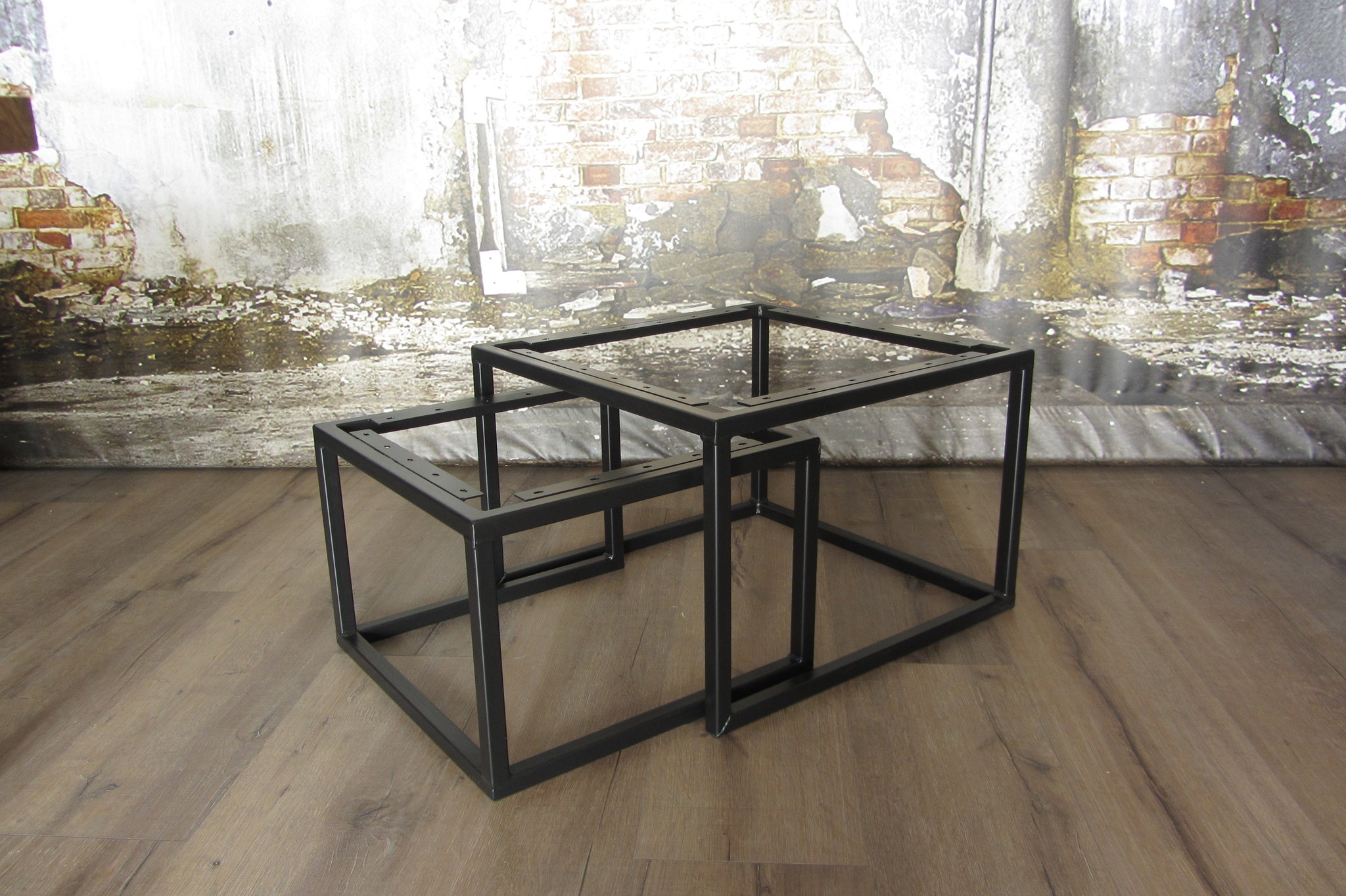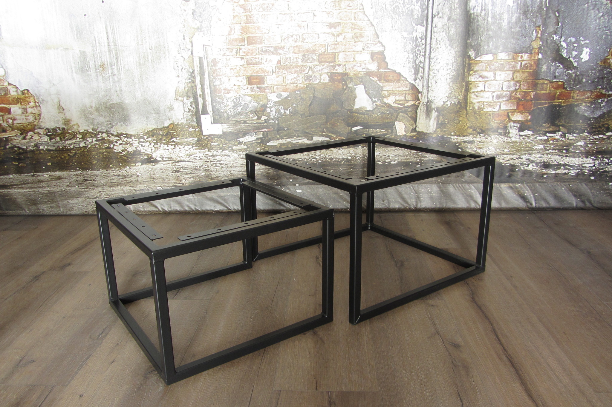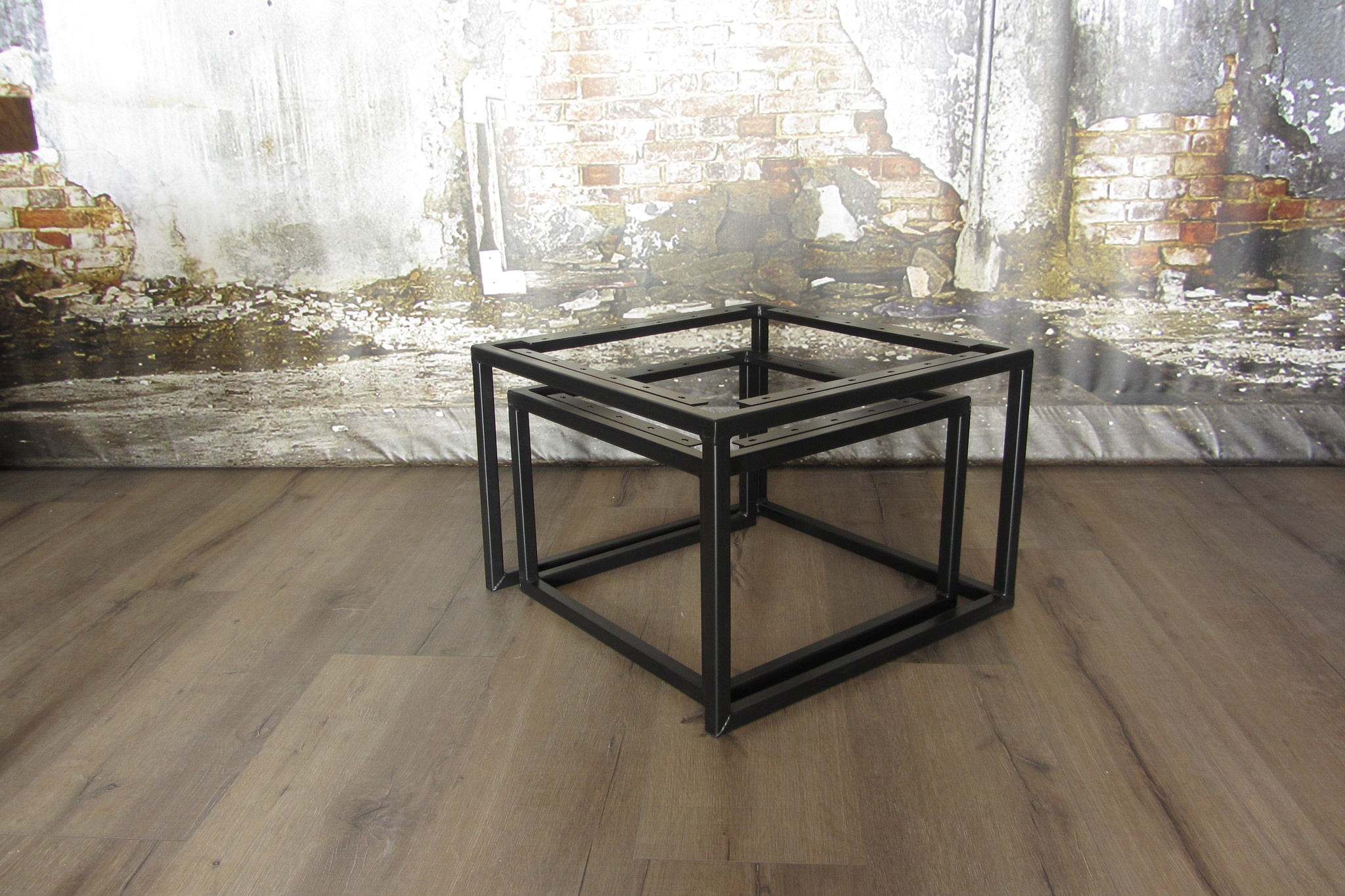 Stalen salontafelframes in vierkante vorm. Deze salontafelset bestaat uit twee tafelframes die je onder elkaar kunt schuiven. Zo kan je zelf kiezen voor één grote salontafel of één kleine. Het kleinste tafeltje is daarnaast ook nog leuk te gebruiken als bijzettafeltje.